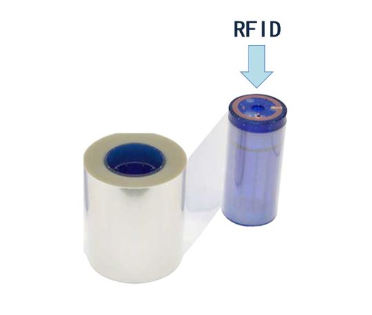 *Note: Sur un des deux rouleaux du ruban de laminage, il y a une antenne de radio-fréquence appelée RFID (voir image). Il ne faut pas retirer cette antenne, puisqu'elle permet à l'imprimante de reconnaître le type de ruban installé dans le module de laminage. Si cette antenne est retirée lors du chargement du ruban, un message d'erreur va apparaître (ex. "Printer Laminate not identified") et suspendre l'impression des cartes restantes. Pour remédier à ce problème, il suffit de remettre l'antenne sur le bon rouleau et de repartir l'imprimante.