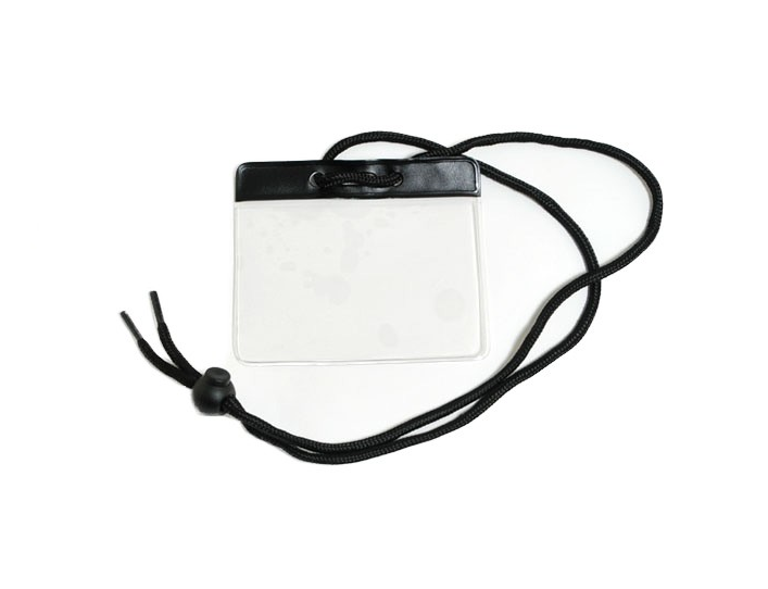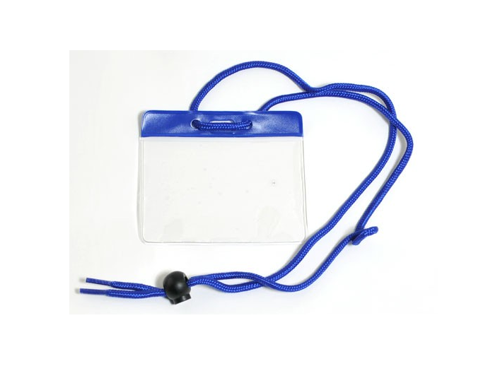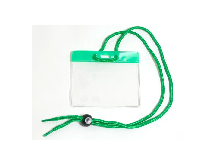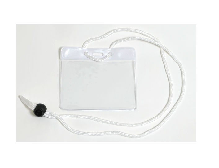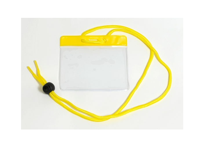 Pochette horizontale en vinyle transparent avec une bande colorée sur le haut de la pochette et une lanière ajustable autour du cou (disponible en 7 couleurs). Vendue en paquet de 100.
